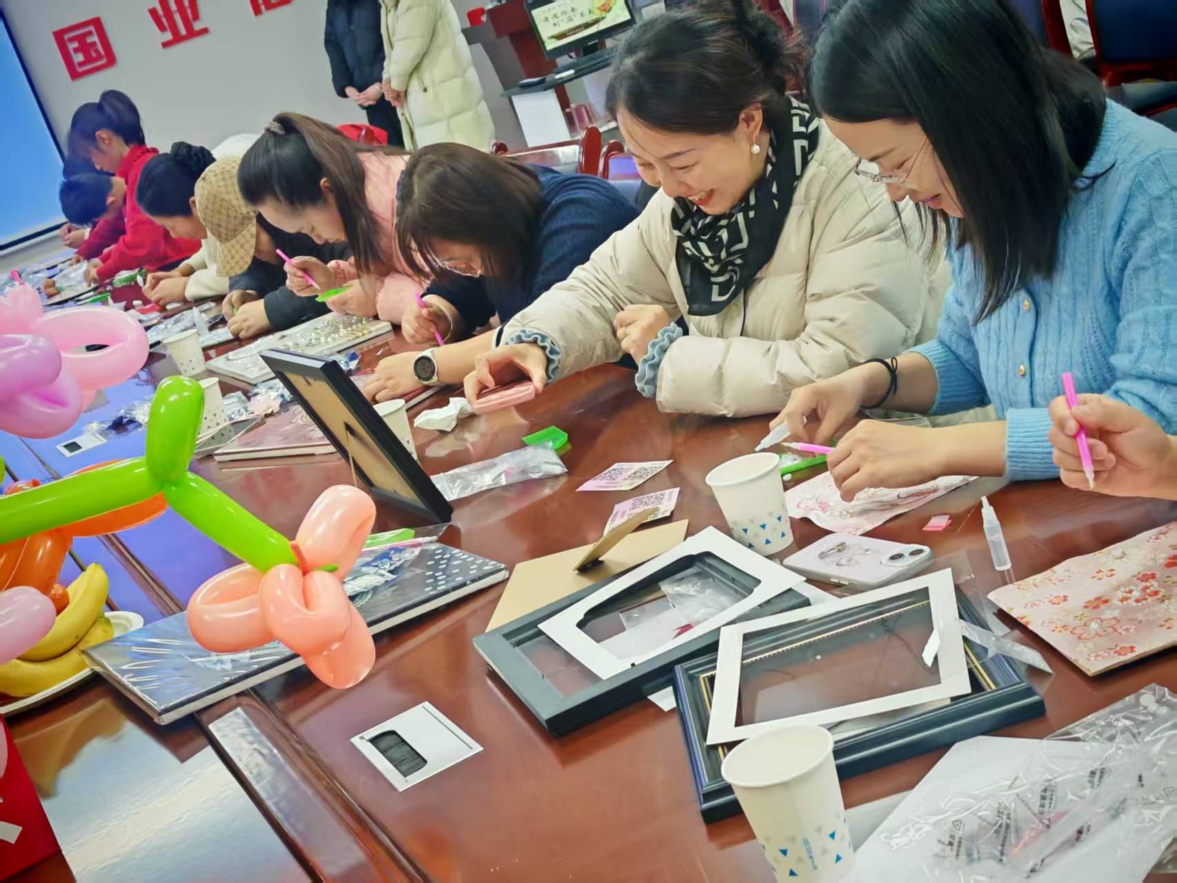 随后,学院党委副书记李宁为女教职工们送上诚挚祝福,并宣布非遗体验活动正式开始。手工制作环节设置了非遗宋锦珍珠扇、宋锦珍珠画、现代珍珠画三大体验项目。活动现场,在舒缓的音乐中,仿佛回到了风雅宋韵时期,一呼一吸间皆是温婉雅致。没有喧嚣纷扰,唯有宋锦的细腻纹理、珍珠的温润光泽与轻柔乐声相融,女老师们静坐案前,穿针引线、慢工细作,于方寸扇面与画框之中,感受宋人闲情雅致的生活意趣,在慢下来的时光里体味传统非遗之美,尽享岁月静好。
